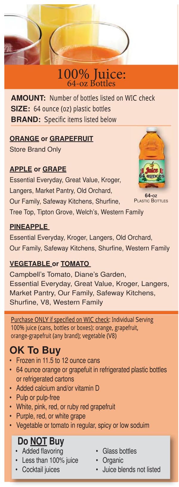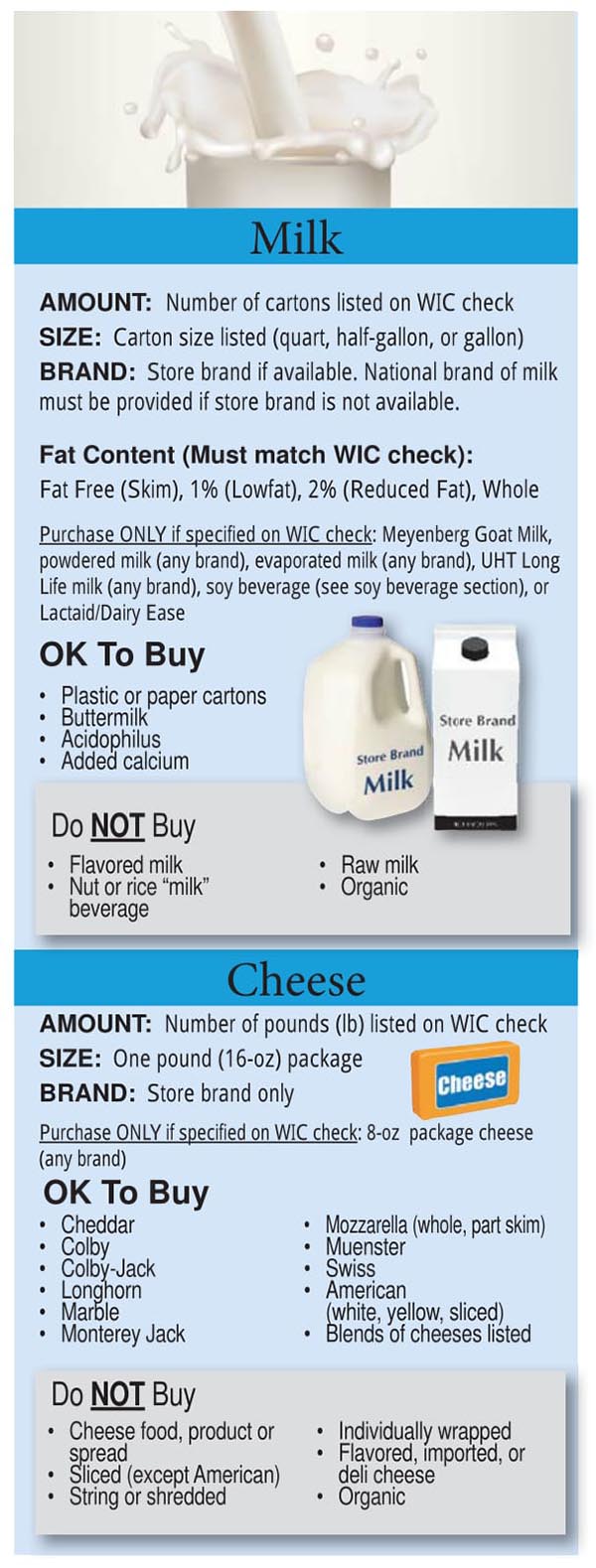 Below is a list of Colorado WIC approved foods. When you go shopping at a grocery store remember to bring your WIC ID folder along with your checks/vouchers or your eWIC card, depending on what the state gives you. You also should bring the Colorado approved WIC food list brochure which you can view below or download here. This will help you determine what items you can purchase. If you do not see the food item you are looking to purchase with your Colorado WIC benefits or have additional questions or issues, then we suggest contacting your local WIC clinic.