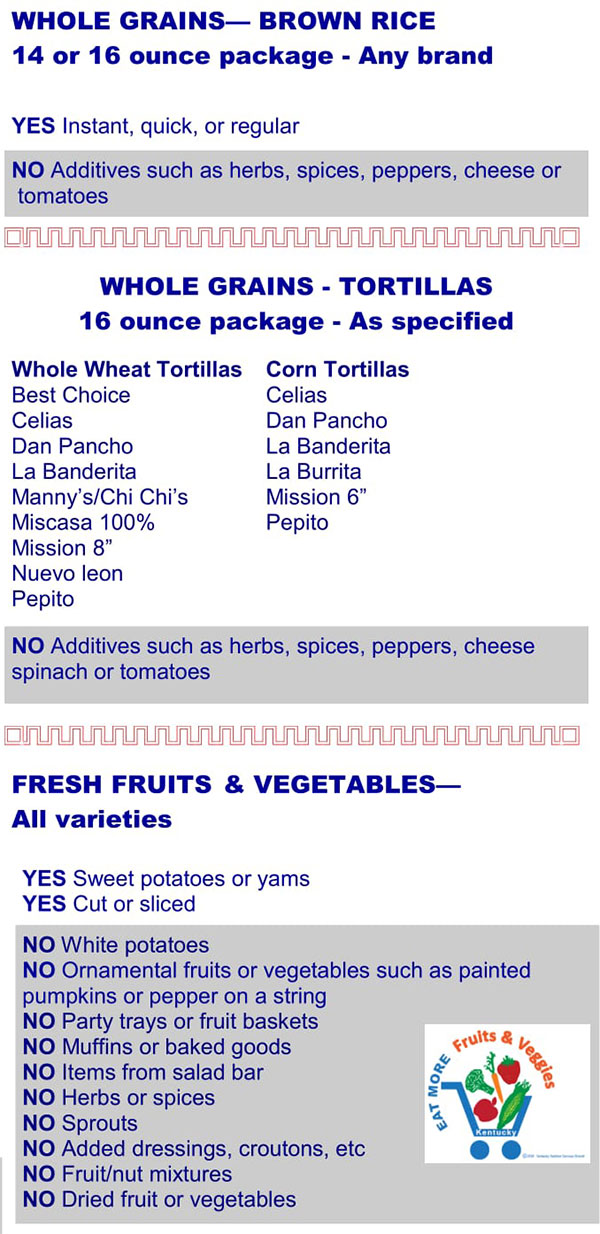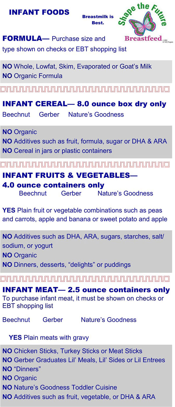 Below is a list of Kentucky WIC approved foods. When you go shopping at a grocery store remember to bring your WIC ID folder along with your checks/vouchers or your eWIC card, depending on what the state gives you. You also should bring the Kentucky approved WIC food list brochure which you can view below or download here. This will help you determine what items you can purchase. If you do not see the food item you are looking to purchase with your Kentucky WIC benefits or have additional questions or issues, then we suggest contacting your local WIC clinic.