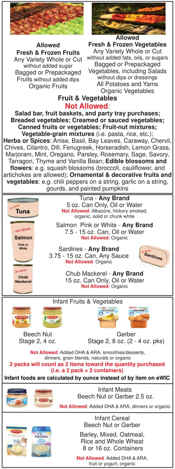 Below is a list of Oklahoma WIC approved foods. When you go shopping at a grocery store remember to bring your WIC ID folder along with your checks/vouchers or your eWIC card, depending on what the state gives you. You also should bring the Oklahoma approved WIC food list brochure which you can view below or download here. This will help you determine what items you can purchase. If you do not see the food item you are looking to purchase with your Oklahoma WIC benefits or have additional questions or issues, then we suggest contacting your local WIC clinic.